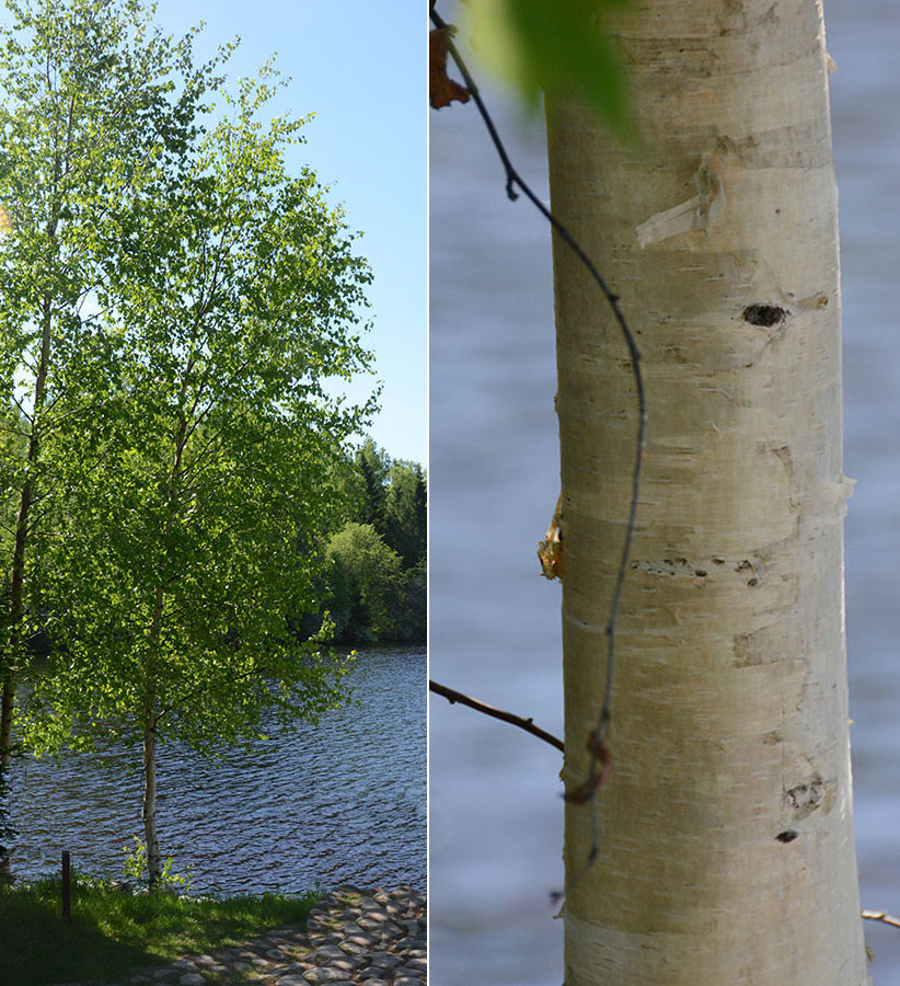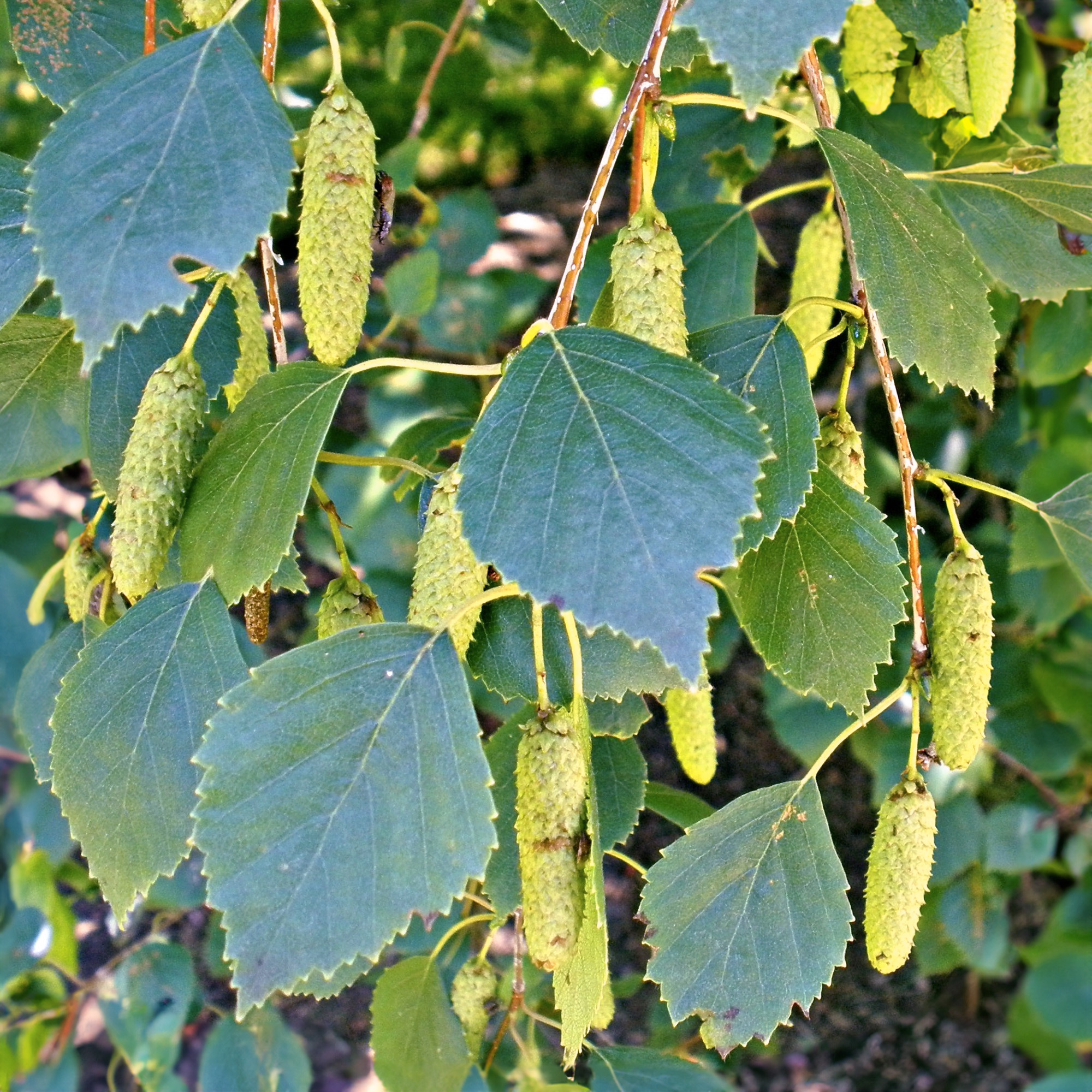 It is a deciduous tree growing to 10-20 m tall. In spring, the male catkins turn yellow and shed their pollen to the green female catkins on the same tree. Leaves are ovate, more rounded at the base than silver birch leaves. Leaf stalks are usually downy, as opposed to hairless on Silver Birch.