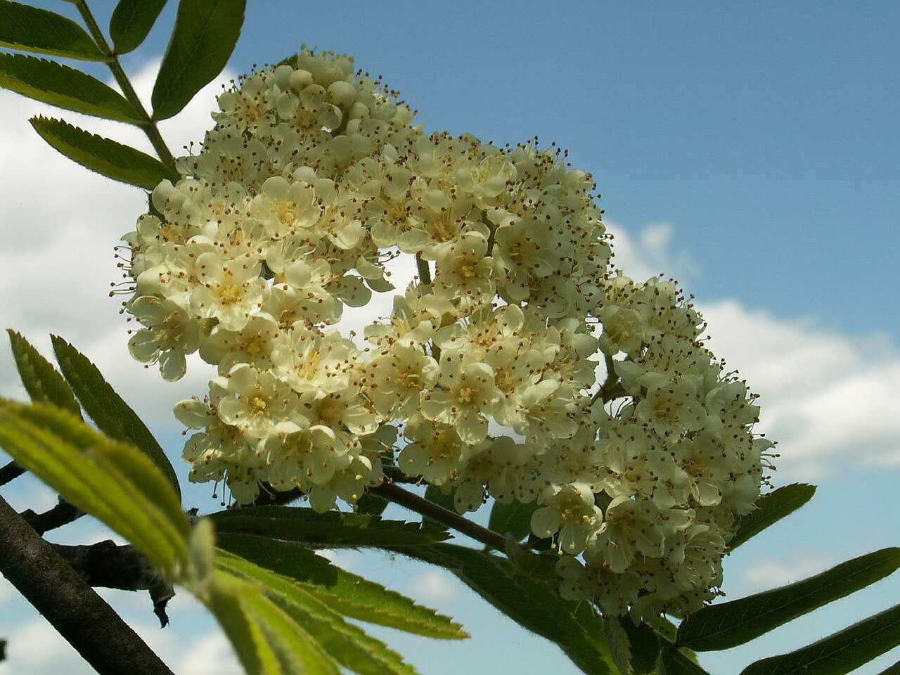 The tree has a slender trunk with smooth bark, a loose and roundish crown, and its leaves are pinnate in pairs of leaflets on a central vein with a terminal leaflet. It blossoms from May to June in dense corymbs of small yellowish white flowers and develops small red pomes as fruit that ripen from August to October and are eaten by many bird species.
